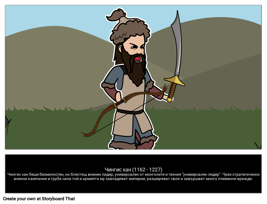 Чингис хан (1162 - 1227)Чингис хан беше безмилостен, но блестящ военен лидер, универсален от монголите и техния "универсален лидер". Чрез стратегически военни кампании и груба сила той и армията му завладяват империи, разширяват своя и завършват много племенни вражди.