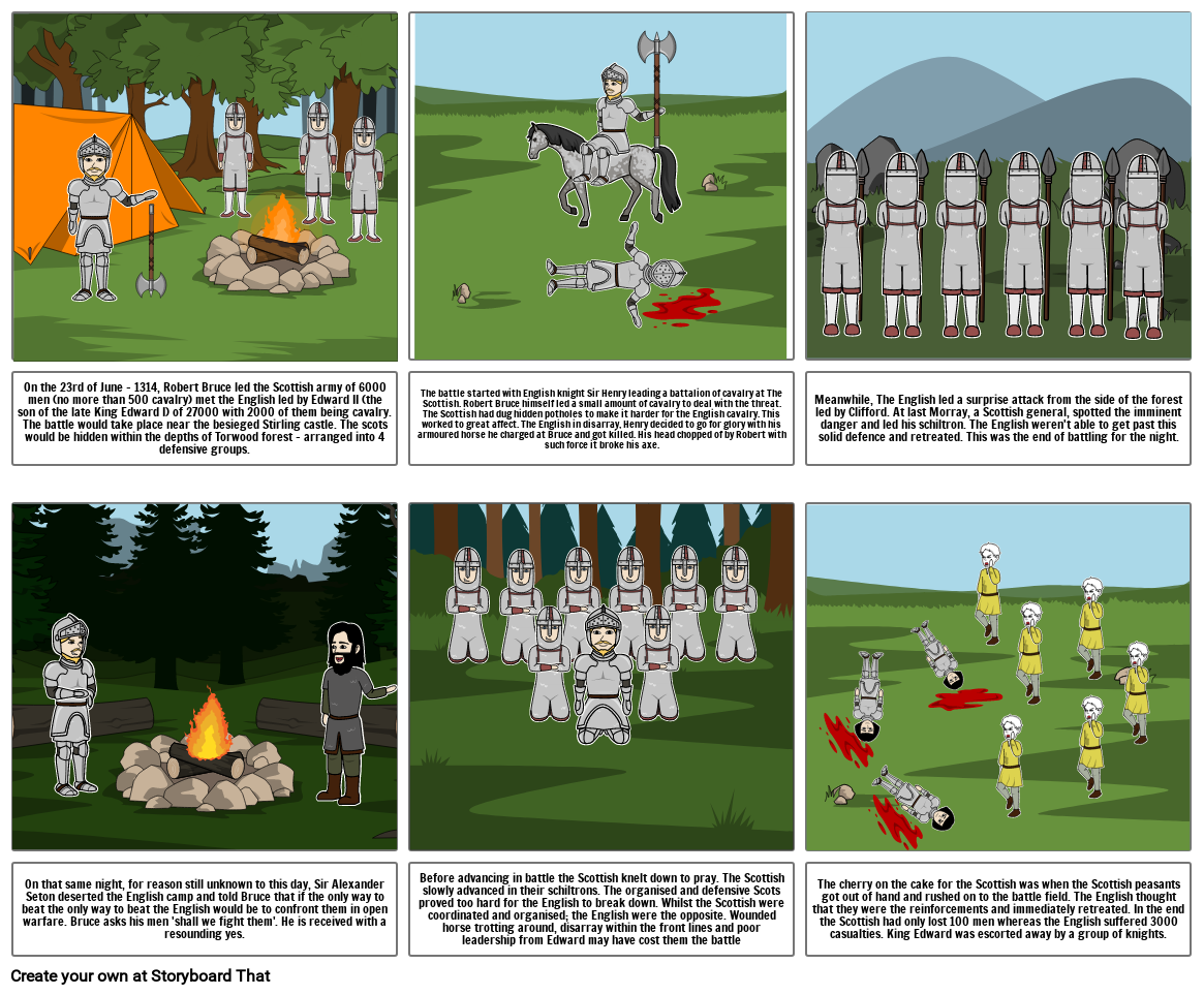 The battle started with English knight Sir Henry leading a battalion of cavalry at The Scottish. Robert Bruce himself led a small amount of cavalry to deal with the threat. The Scottish had dug hidden potholes to make it harder for the English cavalry. This worked to great affect. The English in disarray, Henry decided to go for glory with his armoured horse he charged at Bruce and got killed. His head chopped of by Robert with such force it broke his axe.