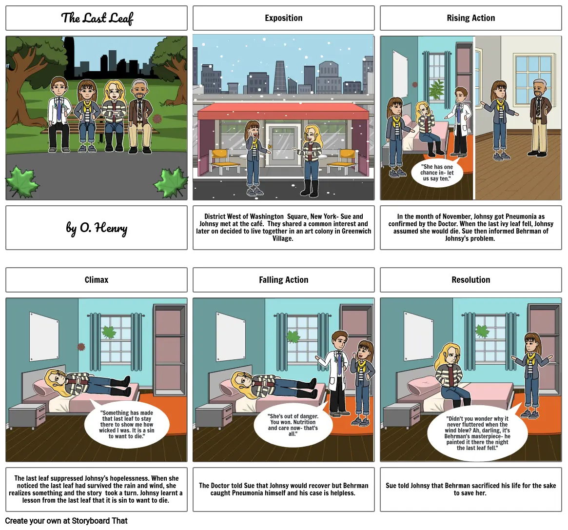 In the month of November, Johnsy got Pneumonia as confirmed by the Doctor. When the last ivy leaf fell, Johnsy assumed she would die. Sue then informed Behrman of Johnsy's problem.