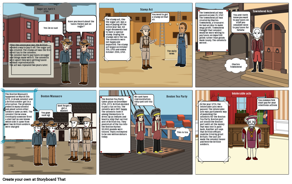 Tho Boston Massacre happened on March 5th 1770. A drunk colonist and a British soldier got in a altercation. The problem ended in many colonist and about seven other soldiers came as well. The colonist threw snow. Eventually someone fired a shot but no one knows which side it came from but two British soldiers were charged