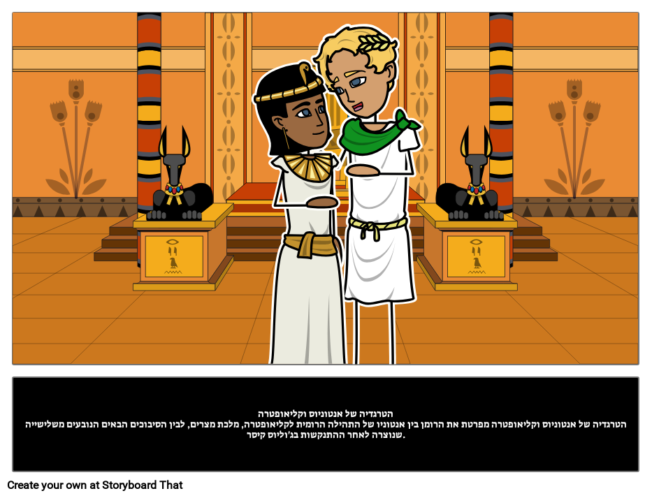 הטרגדיה של אנטוניוס וקליאופטרההטרגדיה של אנטוניוס וקליאופטרה מפרטת את הרומן בין אנטוניו של התהילה הרומית לקליאופטרה, מלכת מצרים, לבין הסיבוכים הבאים הנובעים משלישייה שנוצרה לאחר ההתנקשות בג'וליוס קיסר.