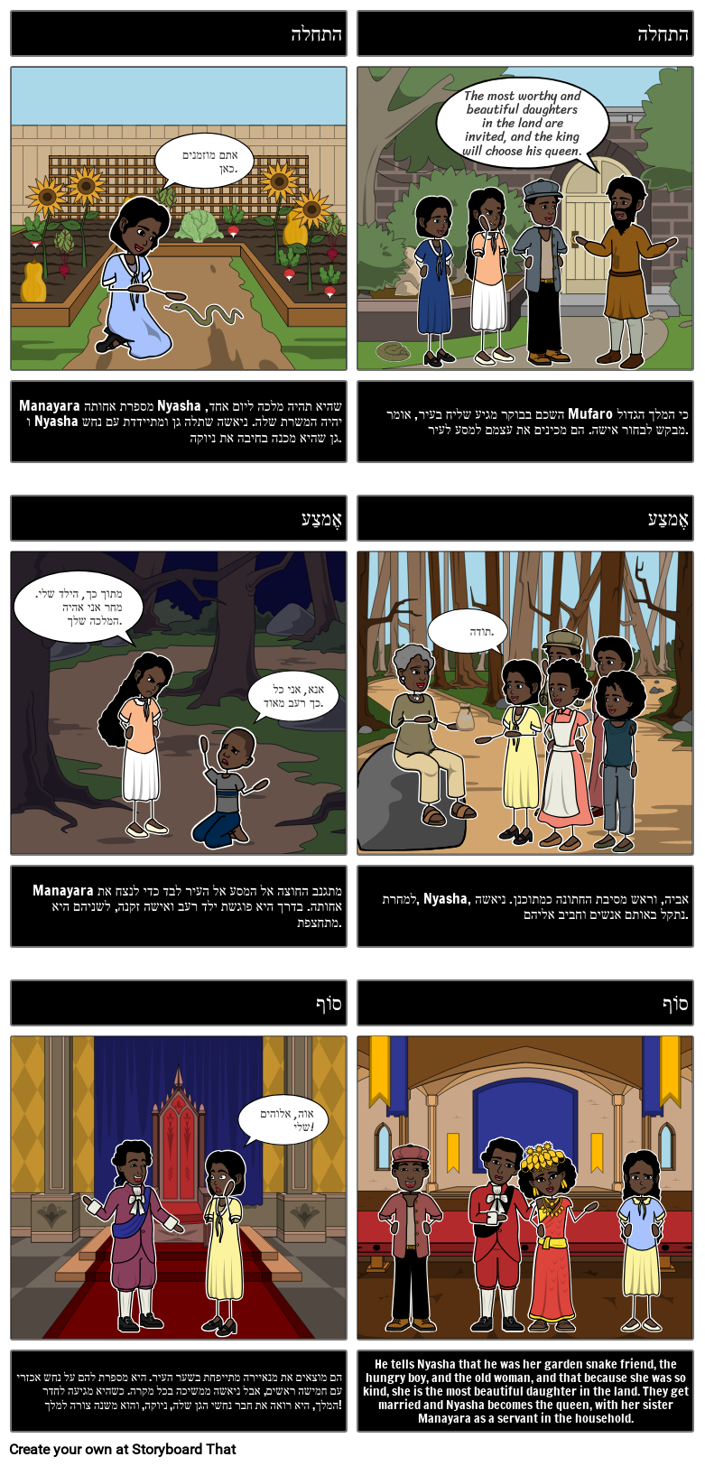 He tells Nyasha that he was her garden snake friend, the hungry boy, and the old woman, and that because she was so kind, she is the most beautiful daughter in the land. They get married and Nyasha becomes the queen, with her sister Manayara as a servant in the household.