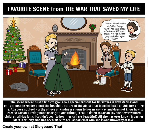 The scene where Susan tries to give Ada a special present for Christmas is devastating and enlightens the reader about the insidious nature of the abuse that Mam inflicted on Ada her entire life. Ada does not feel worthy of love or kindness shown to her in any way and does not know how to receive Susan's loving handmade gift. Ada thinks, "I could listen to Susan say she never wanted children all day long. I couldn’t bear to hear her call me beautiful." All she has ever known from her Mam is cruelty. She has been made to feel ashamed of who she is and unworthy of love.