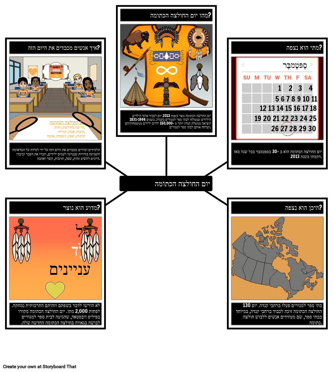 יום החולצה הכתומה החל בשנת 2013 בקנדה להכיר בדורות הטראומה שנגרמו לעמי האומות הראשונות, האינואיטים ומטיס באמצעות מערכת בתי הספר למגורים. מפת עכביש זו כוללת עובדות חשובות על היום. סטודנטים יכולים לחקור מהו יום החולצה הכתומה, מתי הוא מתרחש, היכן הוא מכובד, מדוע הוא נוצר ואיך אנשים מכבדים את היום הזה.