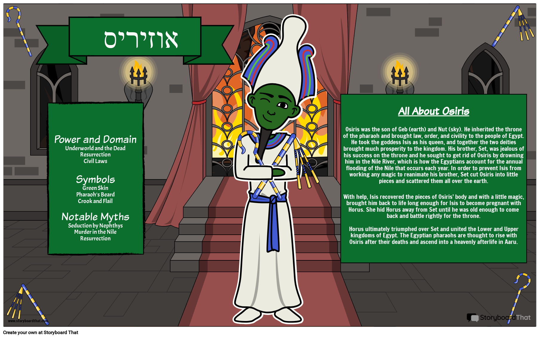 Power and DomainUnderworld and the DeadResurrectionCivil LawsSymbolsGreen SkinPharaoh's BeardCrook and FlailNotable MythsSeduction by NephthysMurder in the NileResurrection