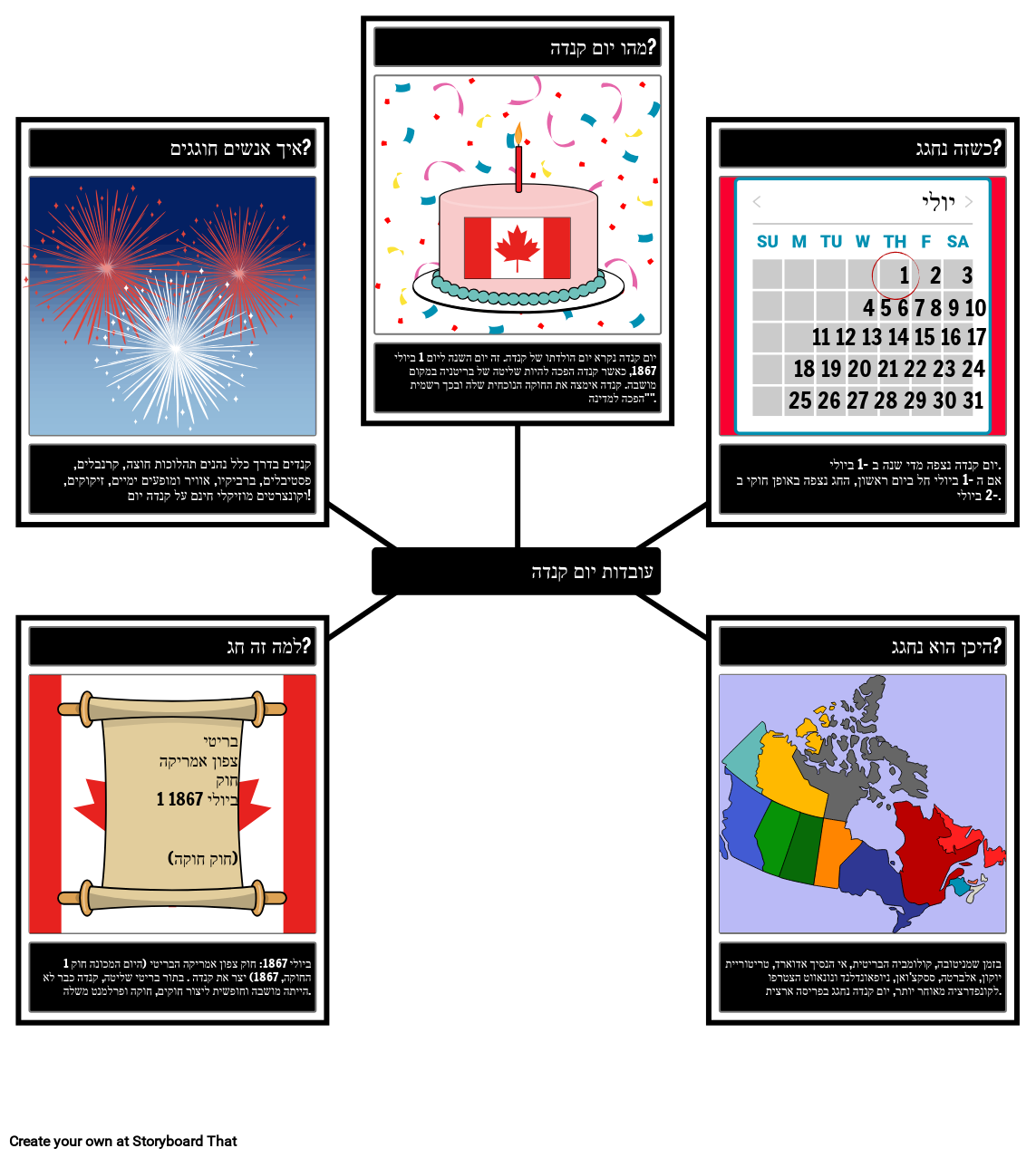 יום קנדה מכונה לפעמים יום הולדתו של קנדה, אך הוא קצת יותר מסובך מזה! התלמידים יכולים ליצור מפת עכביש כדי להסביר את העובדות העיקריות מאחורי יום קנדה העונה על שאלות כגון: מהו יום קנדה? מתי זה? איפה חוגגים אותו? מדוע זה הפך לחג? איך אנשים חוגגים?