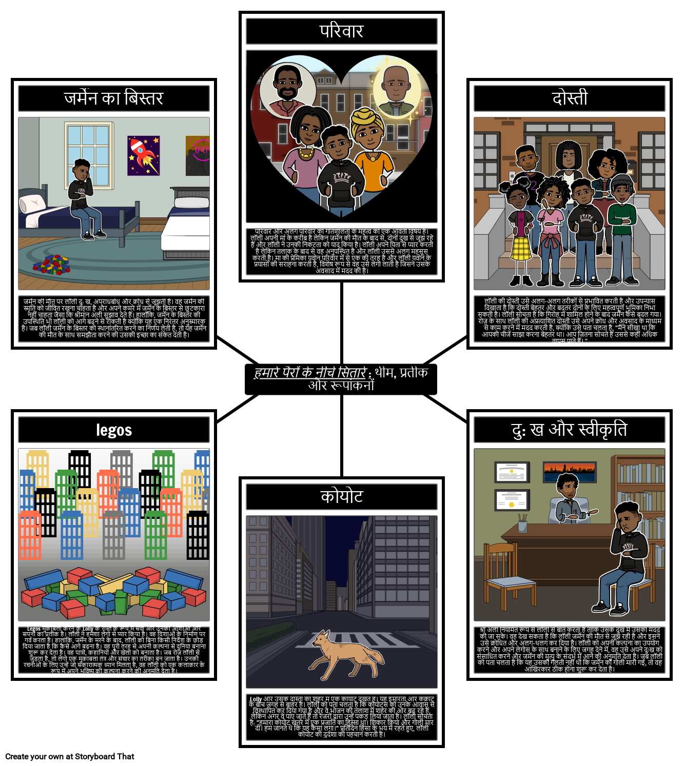 छात्र हमारे पैरों के नीचे सितारों में मौजूद विभिन्न विषयों, प्रतीकों और रूपांकनों को ट्रैक कर सकते हैं और उदाहरणों को स्पष्ट करने के लिए एक मकड़ी का नक्शा बना सकते हैं।