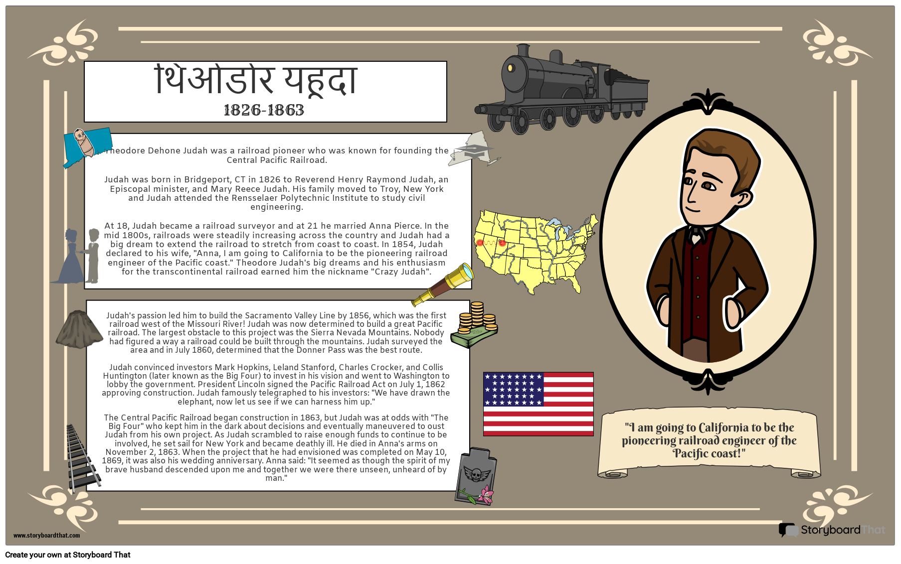 पहले अंतरमहाद्वीपीय रेलमार्ग का अध्ययन करते समय, यह छात्रों के लिए एक प्रभावशाली व्यक्ति या लोगों के समूह के लिए जीवनी पोस्टर बनाने में मददगार होता है। यह उदाहरण इंजीनियर थियोडोर जुदाह को दिखाता है।
