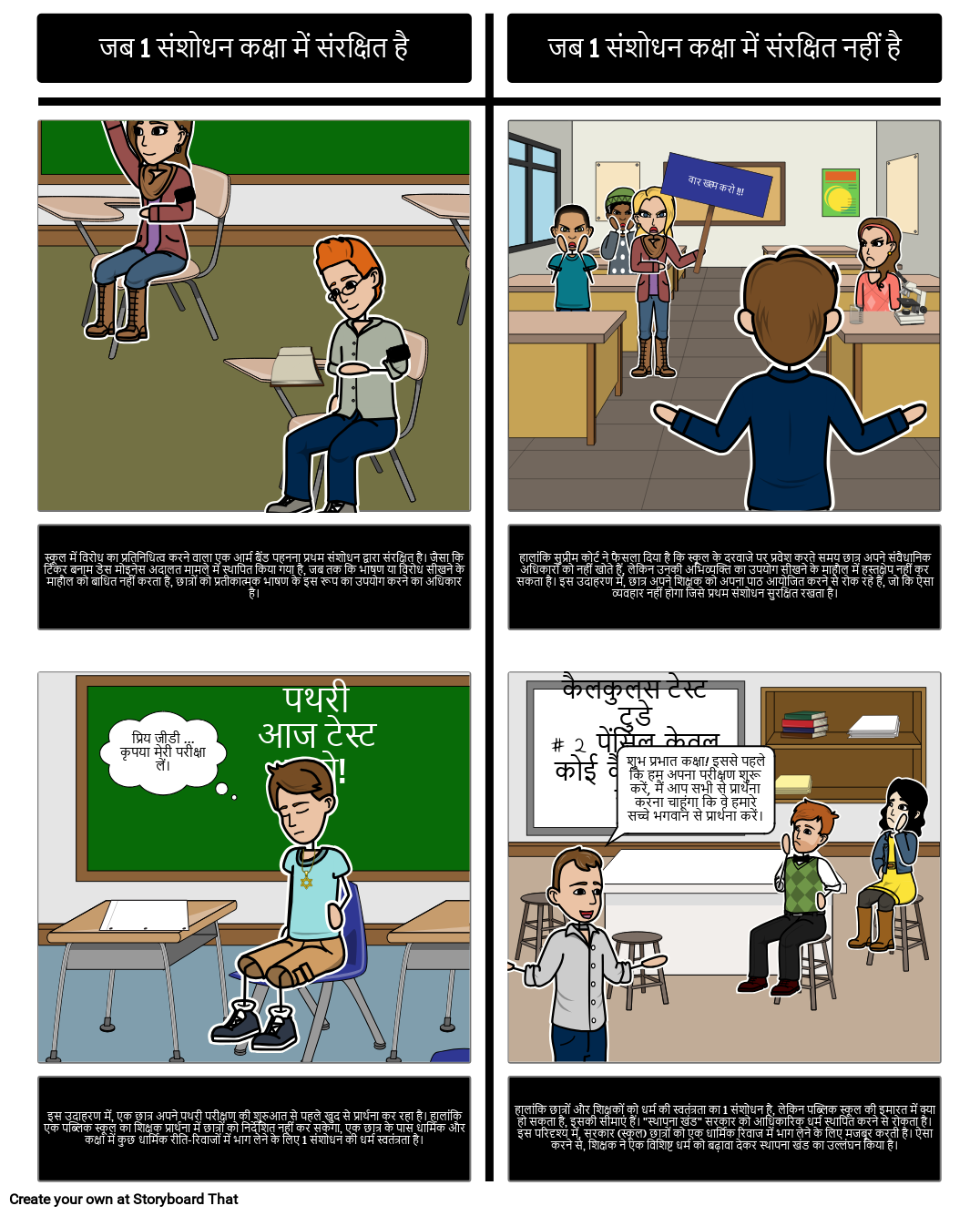 इस उदाहरण में, एक छात्र अपने पथरी परीक्षण की शुरुआत से पहले खुद से प्रार्थना कर रहा है। हालांकि एक पब्लिक स्कूल का शिक्षक प्रार्थना में छात्रों को निर्देशित नहीं कर सकेगा, एक छात्र के पास धार्मिक और कक्षा में कुछ धार्मिक रीति-रिवाजों में भाग लेने के लिए 1 संशोधन की धर्म स्वतंत्रता है।