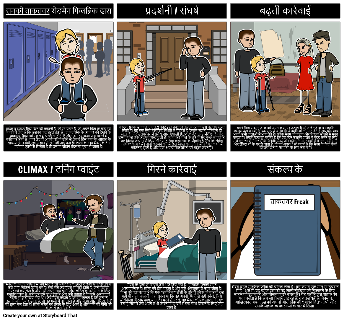 प्लॉट डायग्राम बनाने से न केवल छात्रों को प्लॉट के हिस्सों को सीखने में मदद मिलती है, बल्कि यह प्रमुख घटनाओं को पुष्ट करता है और छात्रों को साहित्यिक संरचनाओं की अधिक समझ विकसित करने में मदद करता है। छात्र छह-कोशिका वाले स्टोरीबोर्ड के साथ काम में कथात्मक चाप को कैप्चर करते हुए एक स्टोरीबोर्ड बना सकते हैं जिसमें प्लॉट आरेख के प्रमुख भाग होते हैं। इस गतिविधि में, छात्र फ्रीक द माइटी में प्रमुख घटनाओं का एक दृश्य प्लॉट आरेख तैयार करेंगे। छात्रों को उपन्यास में प्रमुख मोड़ जैसे एक्सपोज़िशन, राइजिंग एक्शन, क्लाइमेक्स, फॉलिंग एक्शन और रेज़ोल्यूशन की पहचान करनी चाहिए।