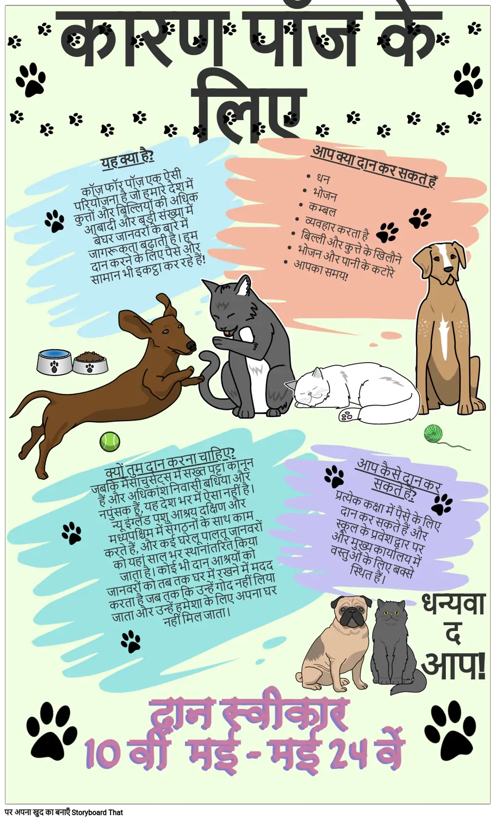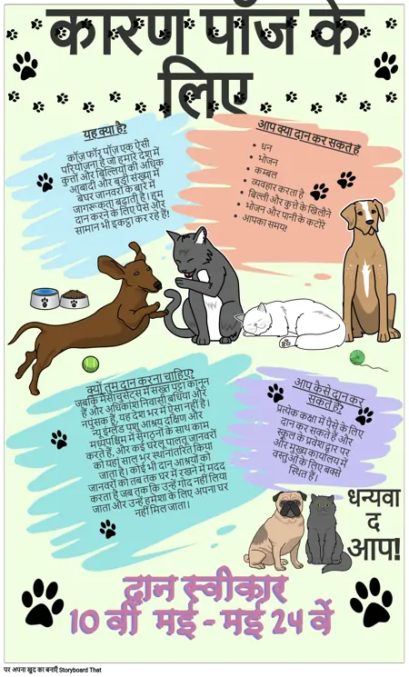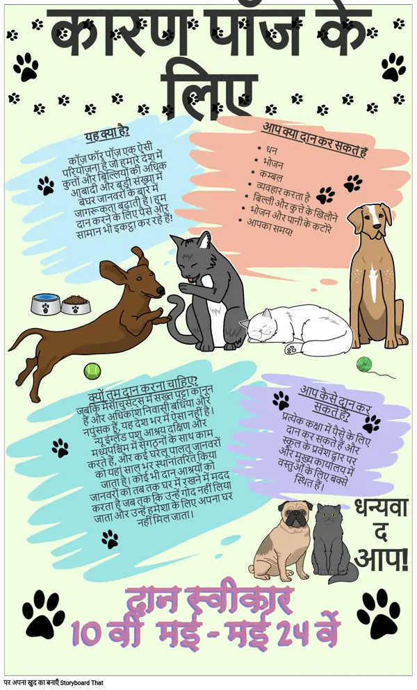 यह क्या है? कॉज़ फॉर पॉज़ एक ऐसी परियोजना है जो हमारे देश में कुत्तों और बिल्लियों की अधिक आबादी और बड़ी संख्या में बेघर जानवरों के बारे में जागरूकता बढ़ाती है। हम दान करने के लिए पैसे और सामान भी इकट्ठा कर रहे हैं!