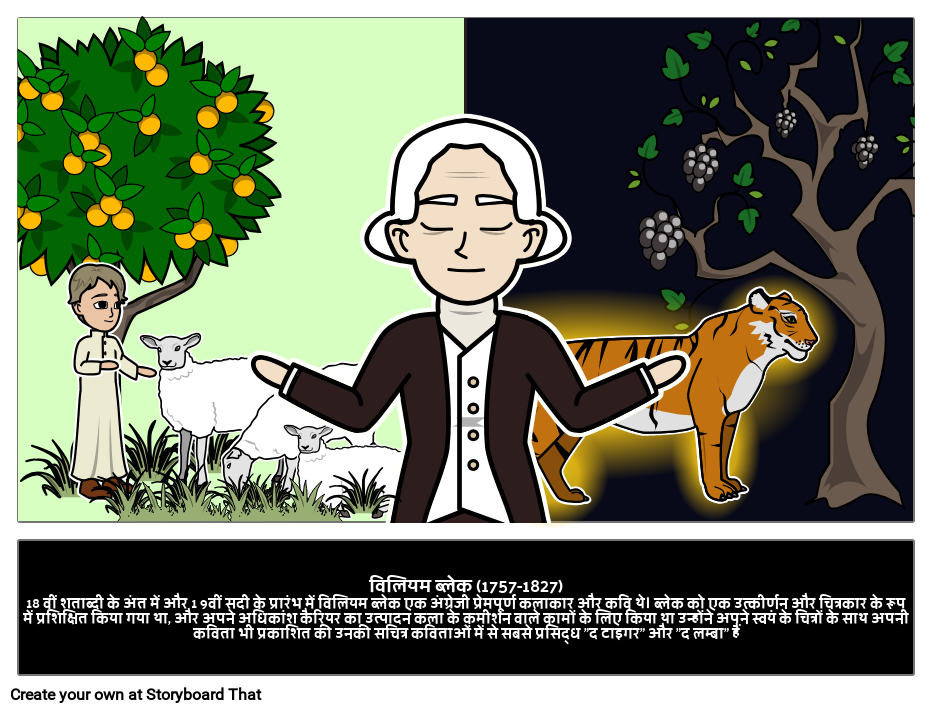 विलियम ब्लेक (1757-1827)18 वीं शताब्दी के अंत में और 1 9वीं सदी के प्रारंभ में विलियम ब्लेक एक अंग्रेजी प्रेमपूर्ण कलाकार और कवि थे। ब्लेक को एक उत्कीर्णन और चित्रकार के रूप में प्रशिक्षित किया गया था, और अपने अधिकांश कैरियर का उत्पादन कला के कमीशन वाले कामों के लिए किया था उन्होंने अपने स्वयं के चित्रों के साथ अपनी कविता भी प्रकाशित की उनकी सचित्र कविताओं में से सबसे प्रसिद्ध "द टाइगर" और "द लम्बा" हैं