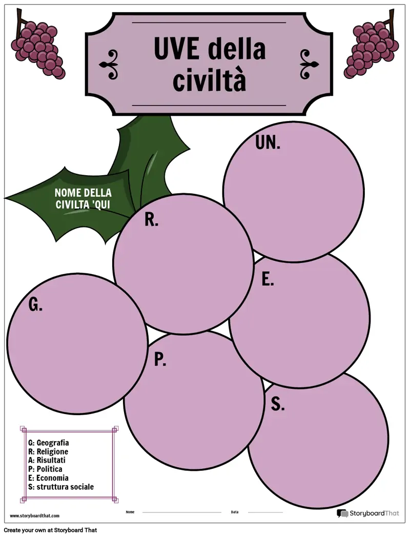 Le civiltà antiche vengono generalmente insegnate concentrandosi sulle aree chiave di: geografia, religione, risultati, politica, economia e struttura sociale utilizzando l'acronimo GRAPES Utilizzando questo acronimo, gli studenti possono compartimentare le loro scoperte e confrontare e contrastare diverse civiltà.