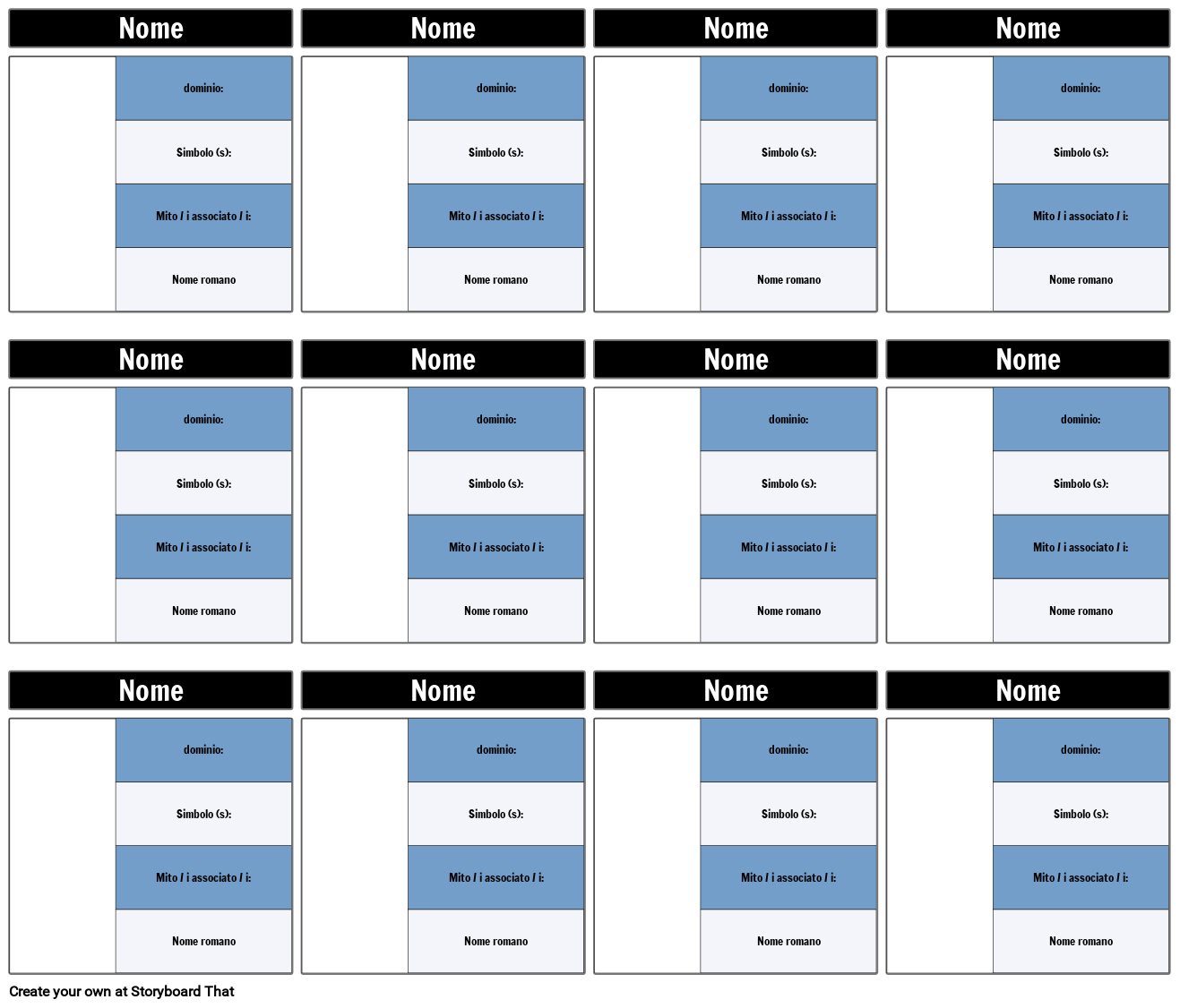 Modello di mappa dei caratteri per gli dei e le dee greche. I campi includono dominio, simbolo, miti associati e nome romano.