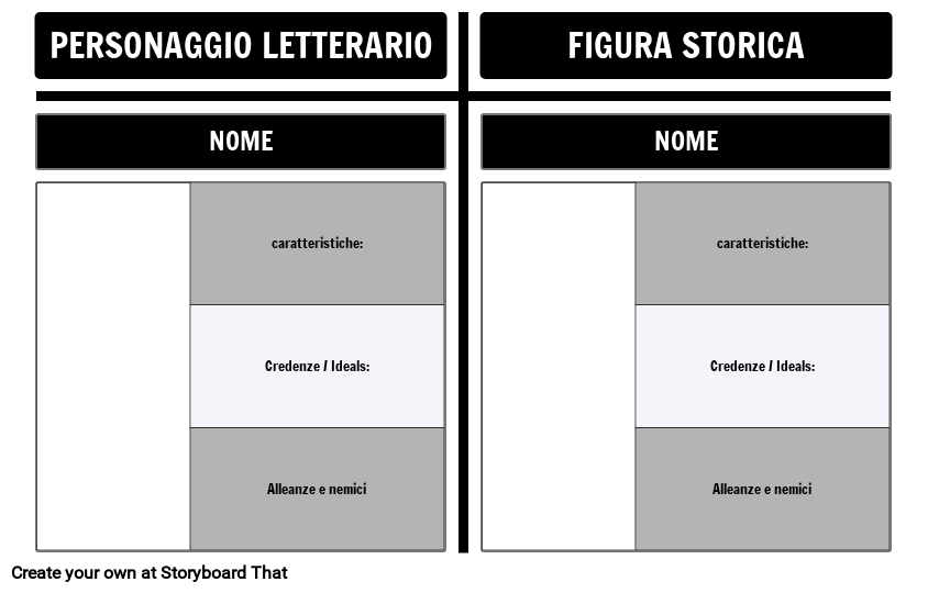 Modello T-Chart personaggio allegoria - Usa questo modello per confrontare personaggi letterari con figure storiche.