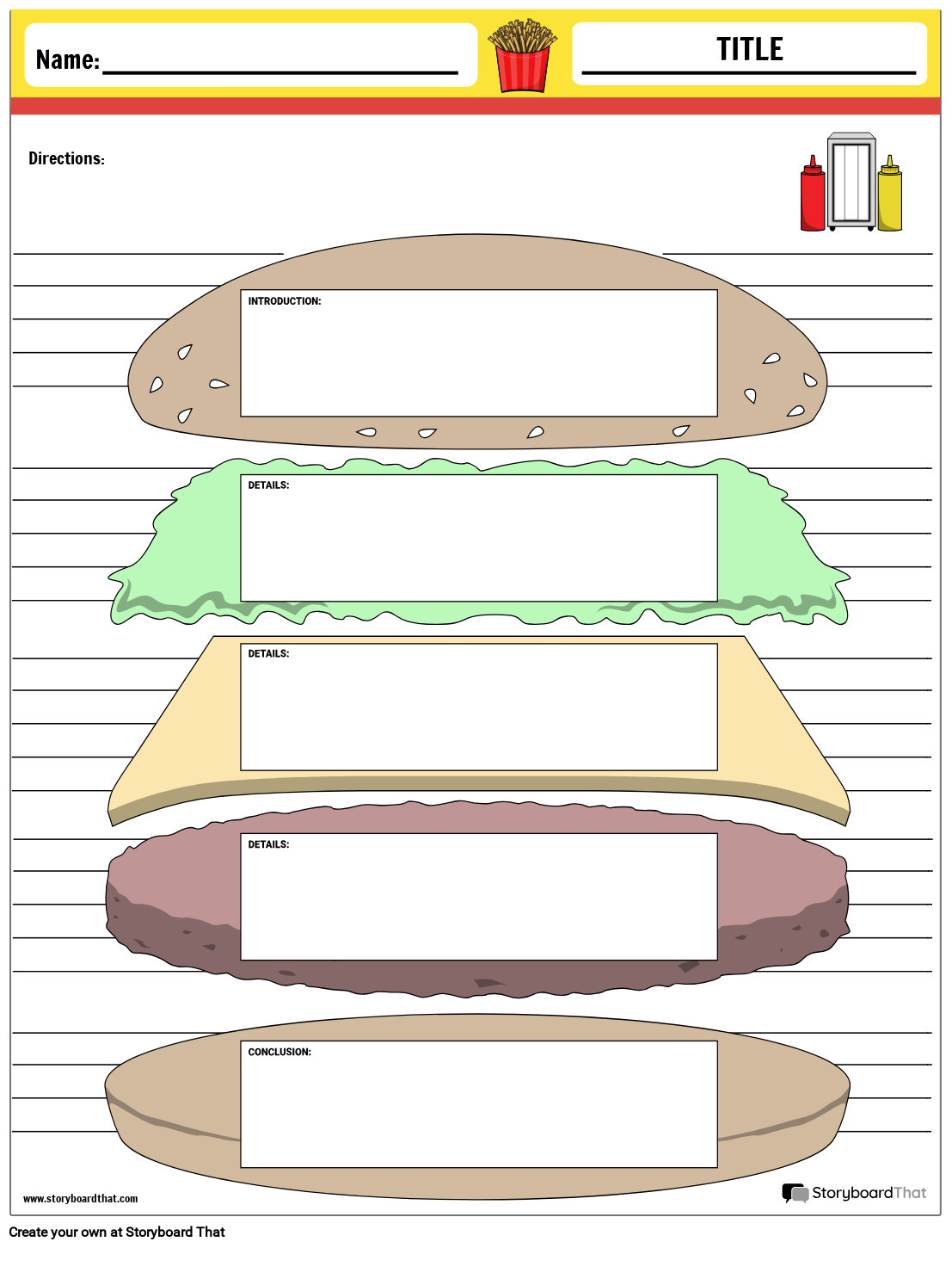 Spalvotas Hamburger grafinis organizatorius su rašymui skirtomis linijomis ir tarpais informacijai apie įvadą, detales ir išvadas.
