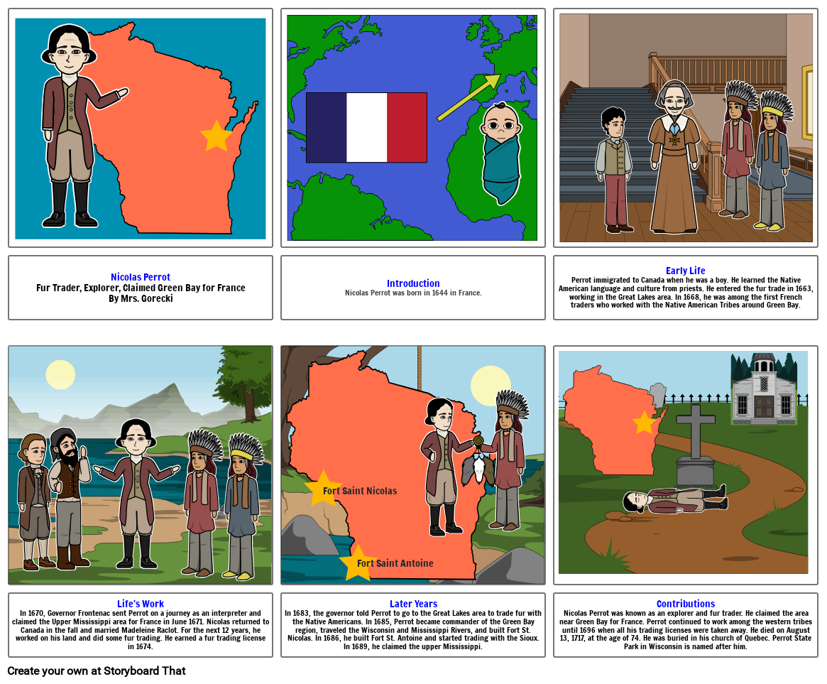 Later YearsIn 1683, the governor told Perrot to go to the Great Lakes area to trade fur with the Native Americans. In 1685, Perrot became commander of the Green Bay region, traveled the Wisconsin and Mississippi Rivers, and built Fort St. Nicolas. In 1686, he built Fort St. Antoine and started trading with the Sioux. In 1689, he claimed the upper Mississippi.