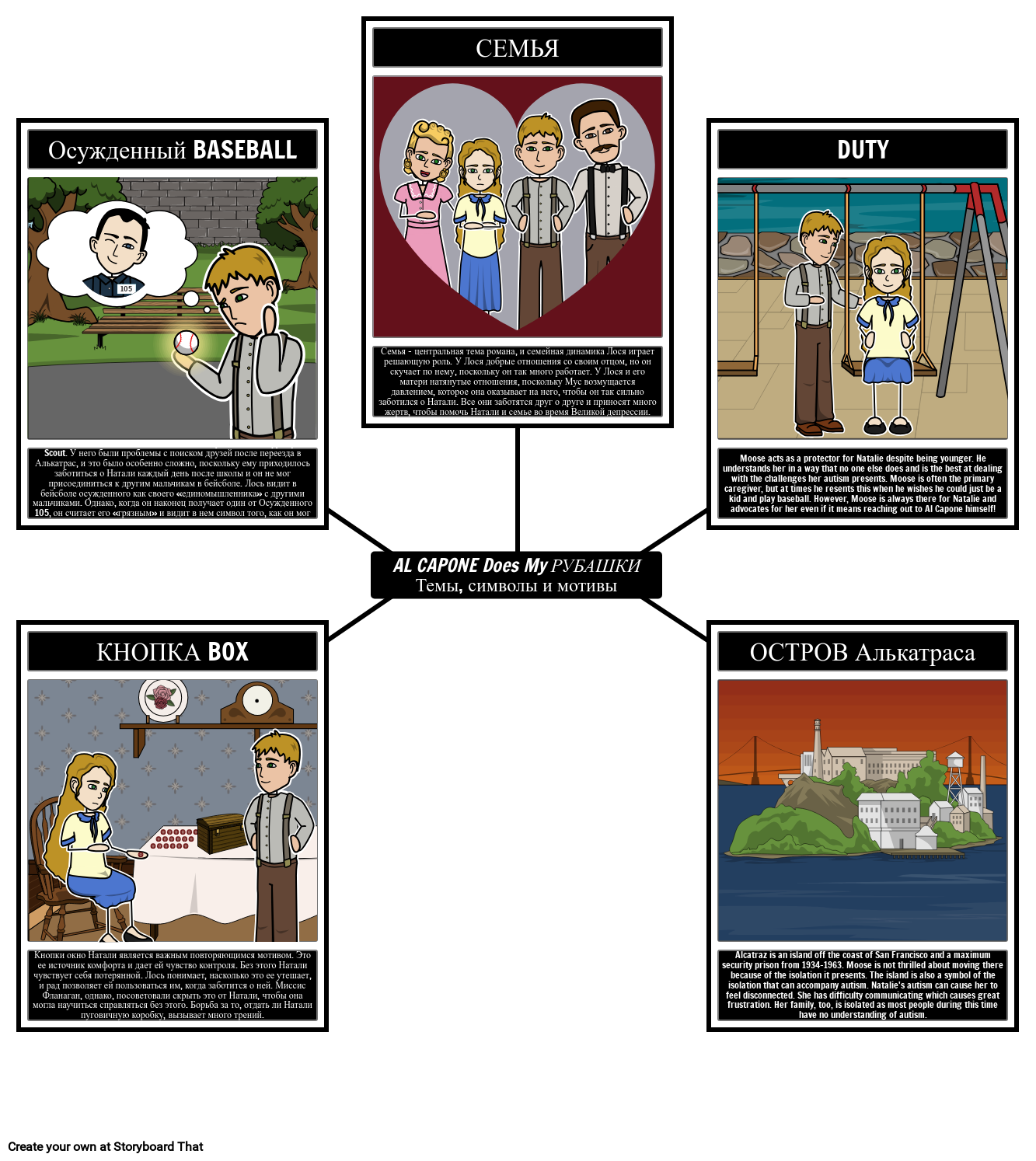 Учащиеся могут отслеживать различные темы, символы и мотивы, присутствующие в «Аль Капоне делает мои рубашки», и создавать карту пауков для иллюстрации примеров.