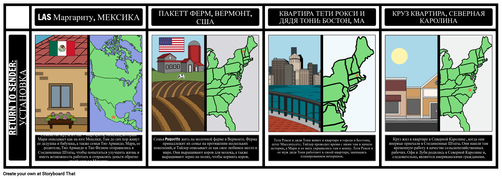 Семейство Круза из Лас - Маргарита, Мексика, который Мари описывает как на юге Мексики. Там до сих пор живут ее дедушка и бабушка, а также семья Тио Армандо. Мари, ее родители, Тио Армандо и Тио Фелипе отправились в Соединенные Штаты, чтобы попытаться улучшить жизнь и иметь возможность работать и отправлять деньги обратно своей семье в Мексику.