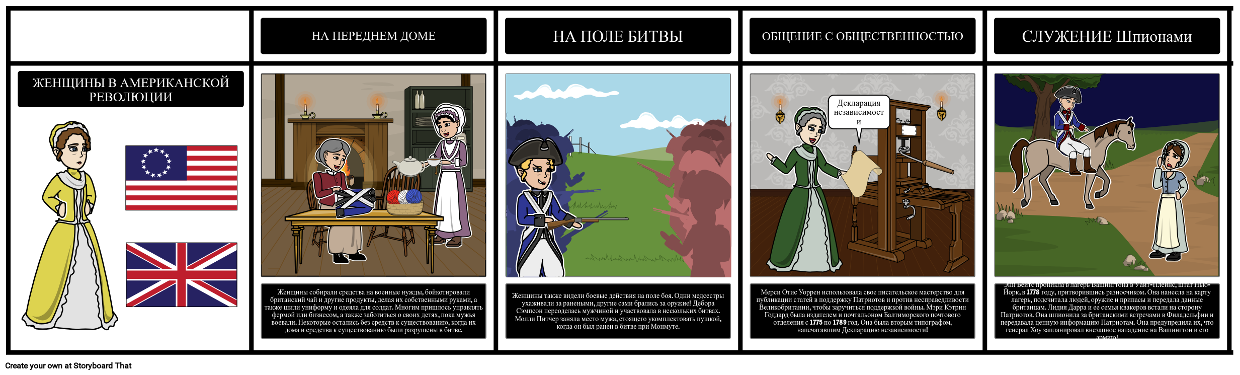 Женщины также видели боевые действия на поле боя. Одни медсестры ухаживали за ранеными, другие сами брались за оружие! Дебора Сэмпсон переоделась мужчиной и участвовала в нескольких битвах. Молли Питчер заняла место мужа, стоящего укомплектовать пушкой, когда он был ранен в битве при Монмуте.
