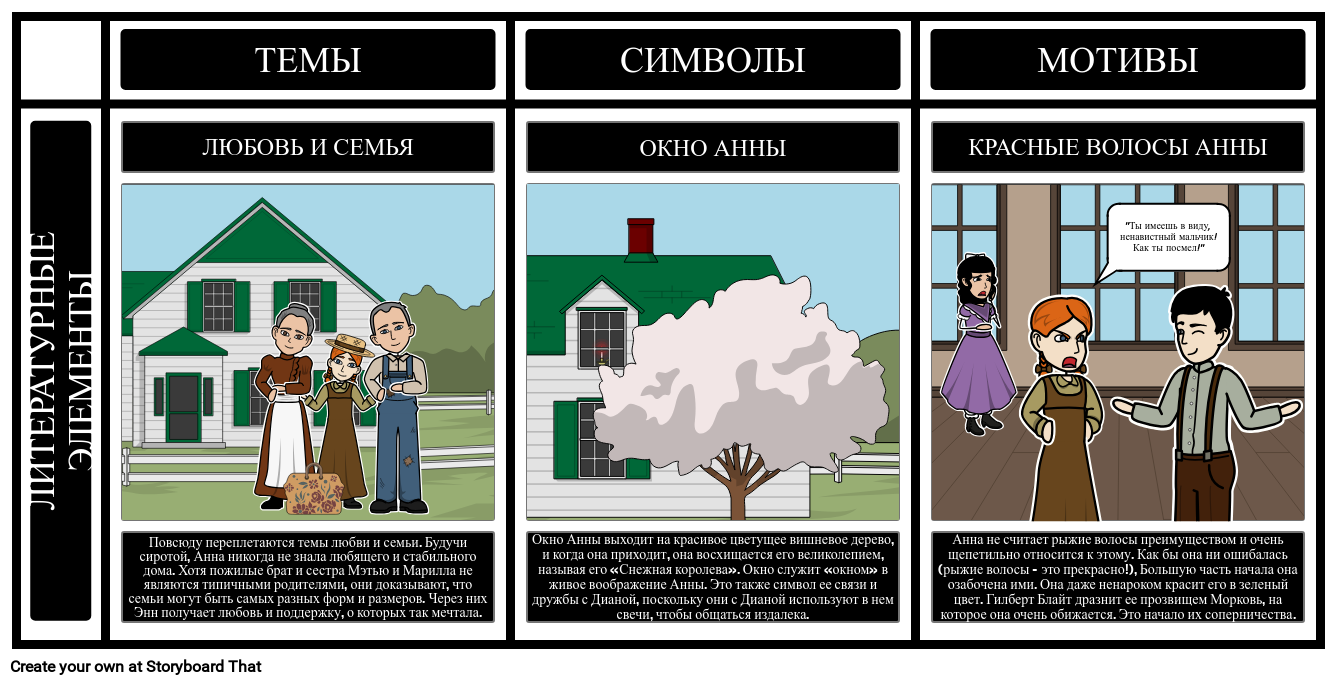 Есть много литературных элементов, которые обогатят историю Анны Зеленой Мезонины. Учащиеся могут отслеживать темы, символы, мотивы и предзнаменования, когда они сталкиваются с ними в романе, и создавать раскадровку с иллюстрациями и описаниями, которые цитируют доказательства из текста.