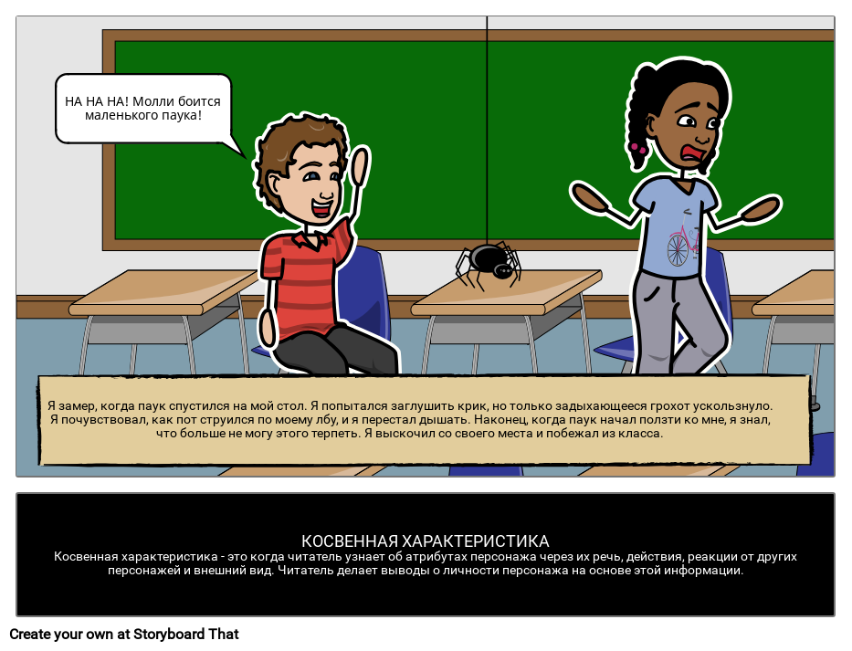 Я замер, когда паук спустился на мой стол. Я попытался заглушить крик, но только задыхающееся грохот ускользнуло. Я почувствовал, как пот струился по моему лбу, и я перестал дышать. Наконец, когда паук начал ползти ко мне, я знал, что больше не могу этого терпеть. Я выскочил со своего места и побежал из класса.