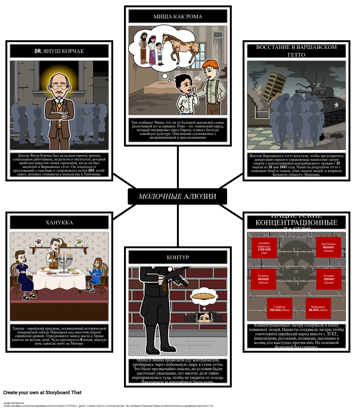 Создайте раскадровку, иллюстрирующую аллюзии в Milkweed Джерри Спинелли.