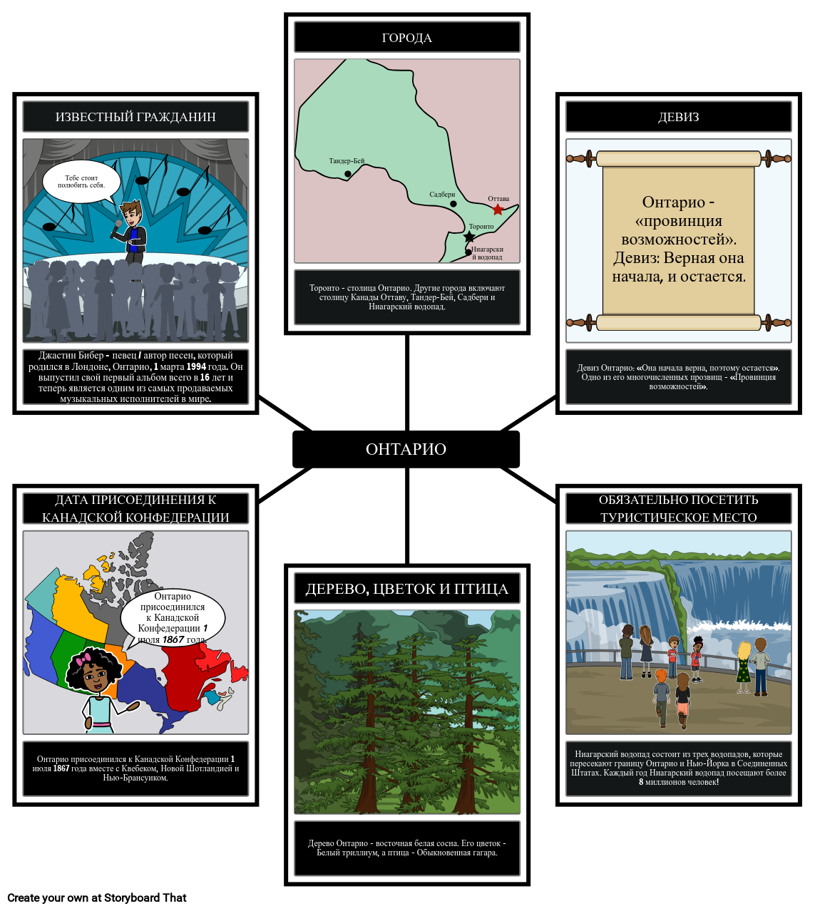 Создайте карту пауков, которая иллюстрирует различные забавные факты и информацию об Онтарио или другой канадской провинции.