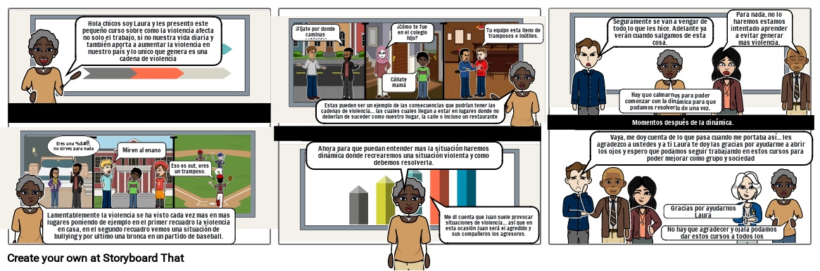 Lamentablemente la violencia se ha visto cada vez mas en mas lugares poniendo de ejemplo en el primer recuadro la violencia en casa, en el segundo recuadro vemos una situación de bullying y por ultimo una bronca en un partido de baseball.