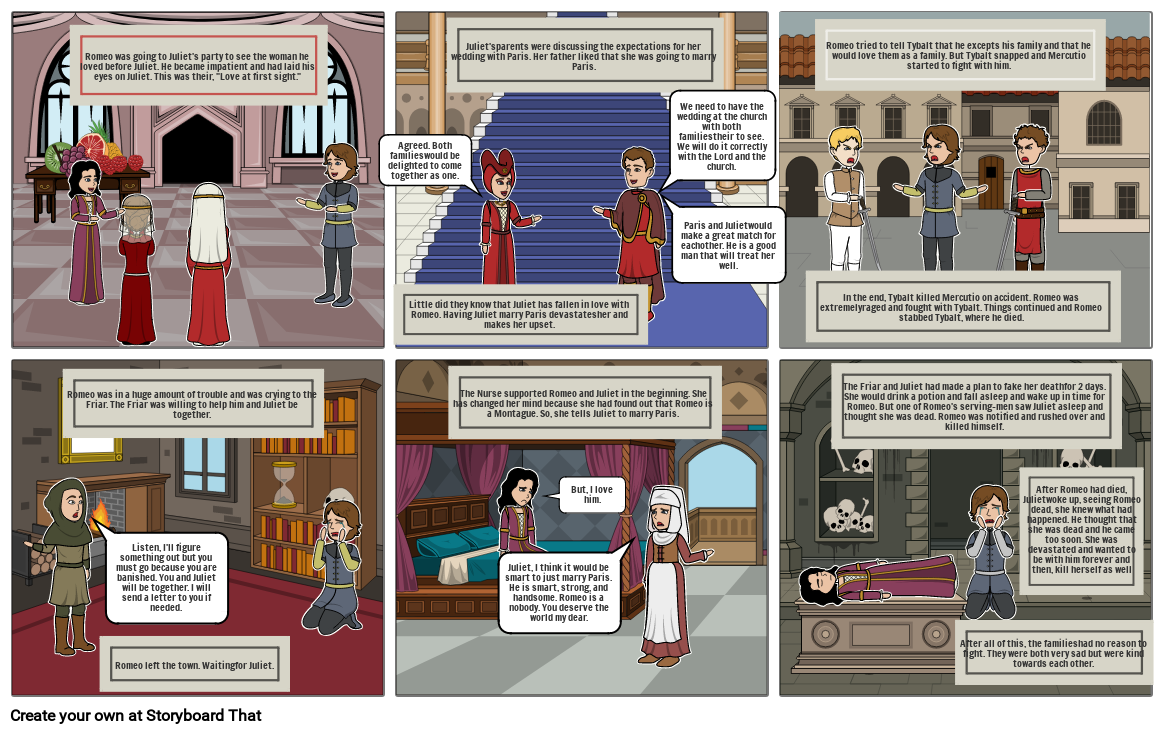 The Friar and Juliet had made a plan to fake her deathfor 2 days. She would drink a potion and fall asleep and wake up in time for Romeo. But one of Romeo's serving-men saw Juliet asleep and thought she was dead. Romeo was notified and rushed over and killed himself.