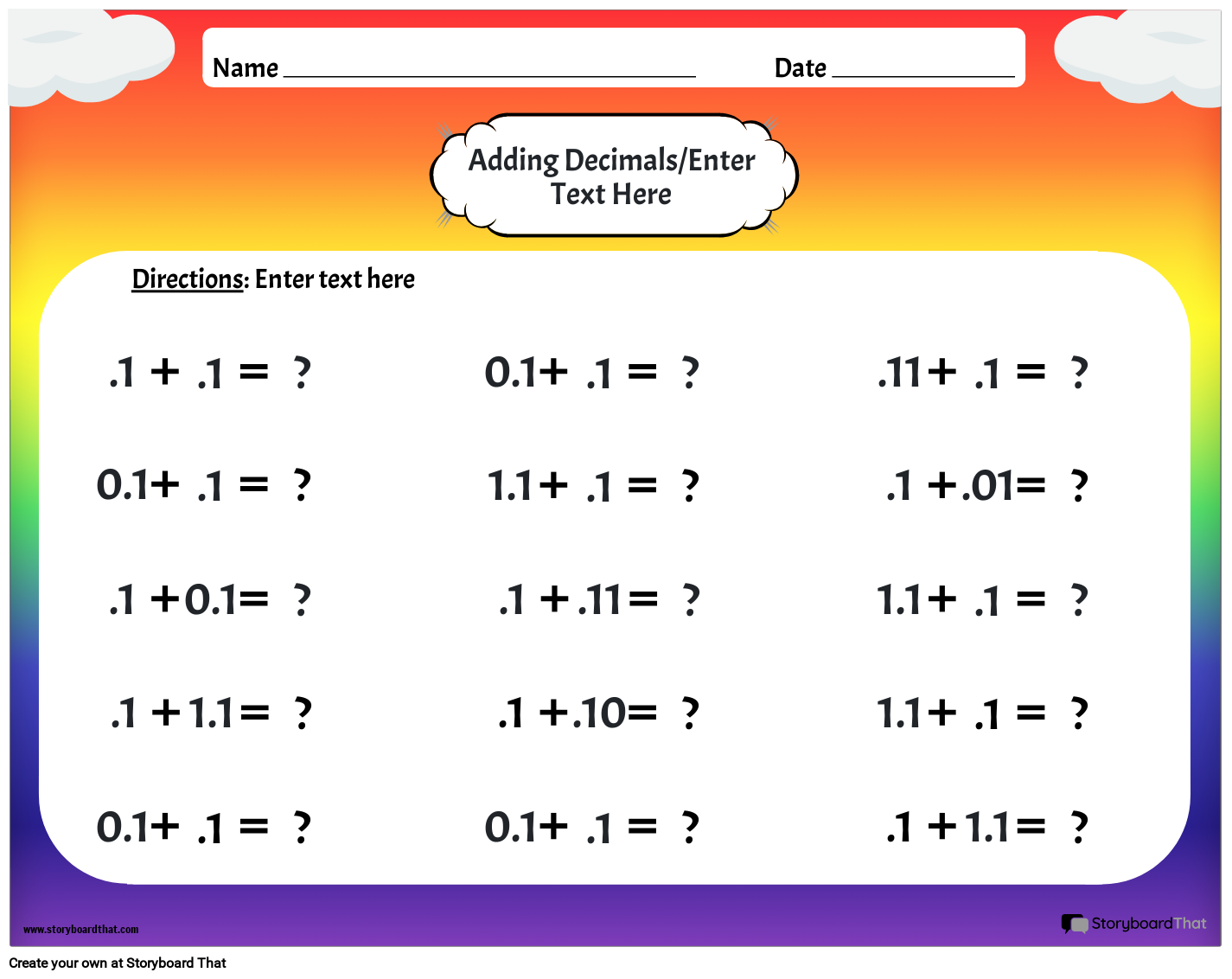 इंद्रधनुष थीम्ड दशमलव कार्यपत्रक।