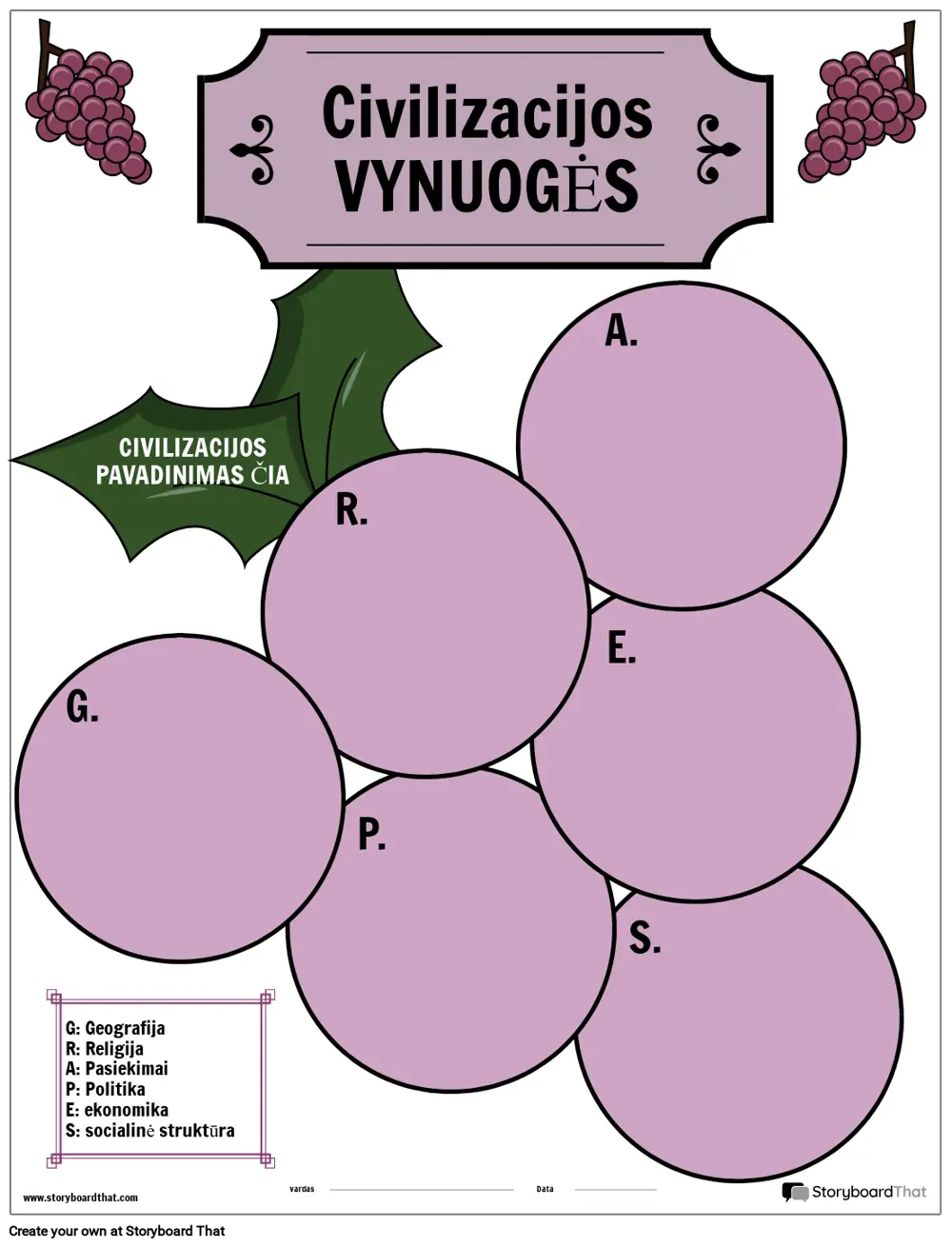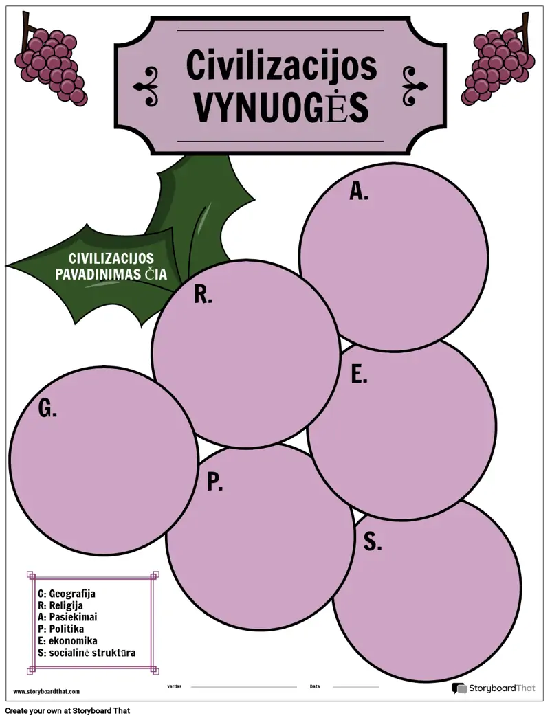 Senovės civilizacijos paprastai mokomos sutelkiant dėmesį į šias pagrindines sritis: geografiją, religiją, pasiekimus, politiką, ekonomiką ir socialinę struktūrą, naudojant akronimą GRAPES. Naudodami šį santrumpą, mokiniai gali suskirstyti savo atradimus ir palyginti bei supriešinti skirtingas civilizacijas.