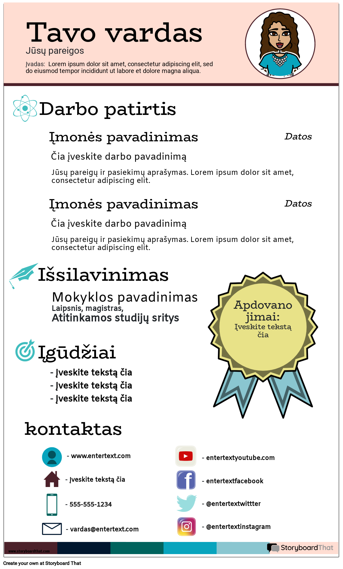 Sukurti CV infografiką | Tinkinti CV infografiniai šablonai leidžia lengvai parodyti įgūdžius arba praktikuoti CV rašymą. Apdovanojimai ir ikonos.