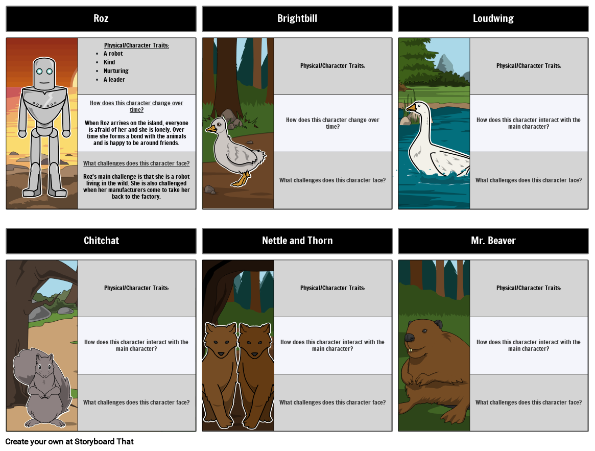 Physical/Character Traits:A robotKindNurturingA leader How does this character change over time?When Roz arrives on the island, everyone is afraid of her and she is lonely. Over time she forms a bond with the animals and is happy to be around friends. What challenges does this character face?Roz's main challenge is that she is a robot living in the wild. She is also challenged when her manufacturers come to take her back to the factory.