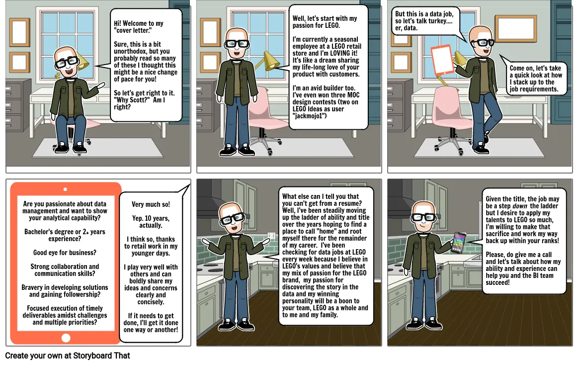 What else can I tell you that you can't get from a resume? Well, I've been steadily moving up the ladder of ability and title over the years hoping to find a place to call "home" and root myself there for the remainder of my career. I've been checking for data jobs at LEGO every week because I believe in LEGO's values and believe that my mix of passion for the LEGO brand, my passion for discovering the story in the data and my winning personality will be a boon to your team, LEGO as a whole and to me and my family.