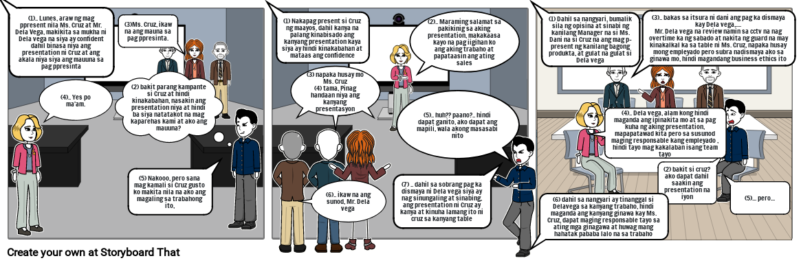 (7) .. dahil sa sobrang pag ka dismaya ni Dela vega siya ay nag sinungaling at sinabing, ang presentation ni Cruz ay kanya at kinuha lamang ito ni cruz sa kanyang table