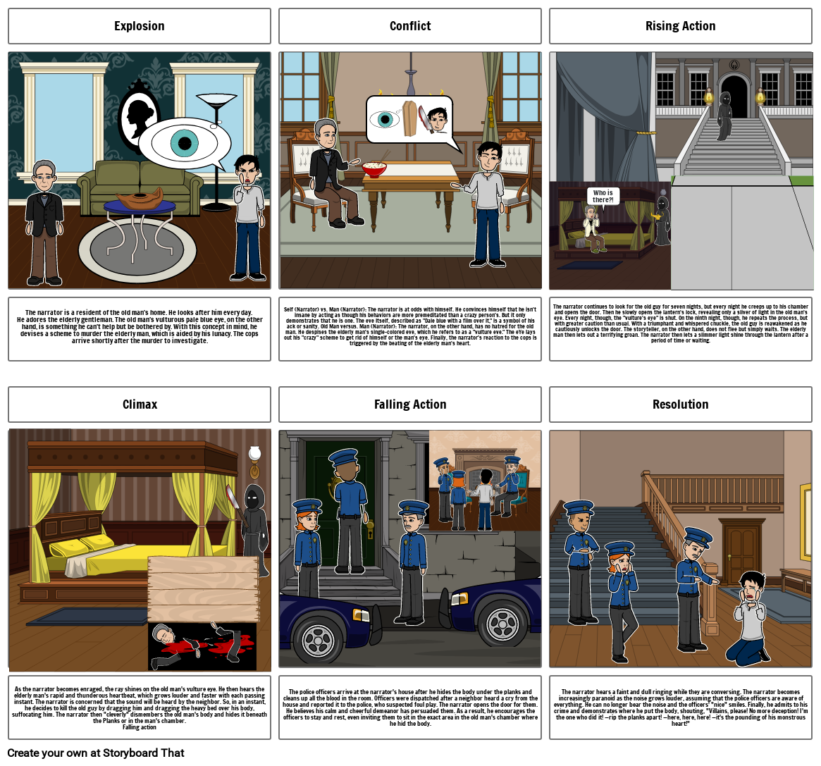 Self (Narrator) vs. Man (Narrator): The narrator is at odds with himself. He convinces himself that he isn't insane by acting as though his behaviors are more premeditated than a crazy person's. But it only demonstrates that he is one. The eve Itself, described as "Dale blue with a film over it," is a symbol of his ack or sanity. Old Man versus. Man (Narrator): The narrator, on the other hand, has no hatred for the old man. He despises the elderly man's single-colored eve, which he refers to as a "vulture eve." The eYe lays out his "crazy" scheme to get rid of himself or the man's eye. Finally, the narrator's reaction to the cops is triggered by the beating of the elderly man's heart.