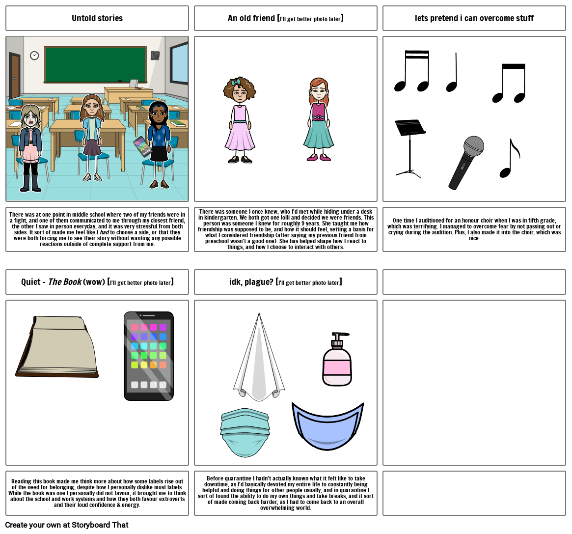 Before quarantine I hadn't actually known what it felt like to take downtime, as I'd basically devoted my entire life to constantly being helpful and doing things for other people usually, and in quarantine I sort of found the ability to do my own things and take breaks, and it sort of made coming back harder, as I had to come back to an overall overwhelming world.