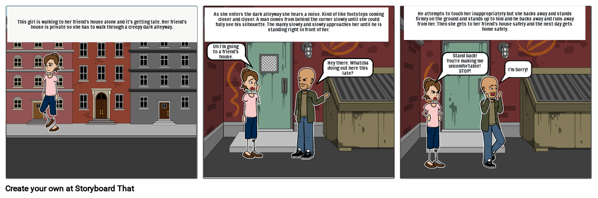 He attempts to touch her inappropriately but she backs away and stands firmly on the ground and stands up to him and he backs away and runs away from her. Then she gets to her friend's house safely and the next day gets home safely.