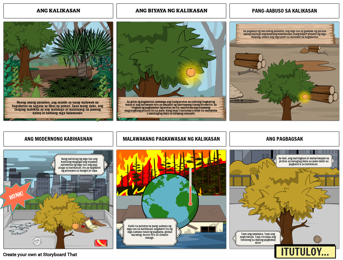 Dahil sa patuloy na pang-aabuso ng mga tao sa kalikasan, nagdulot ito ng mga sakuna tulad ng pagbaha, global warming, forest fire at climate change.