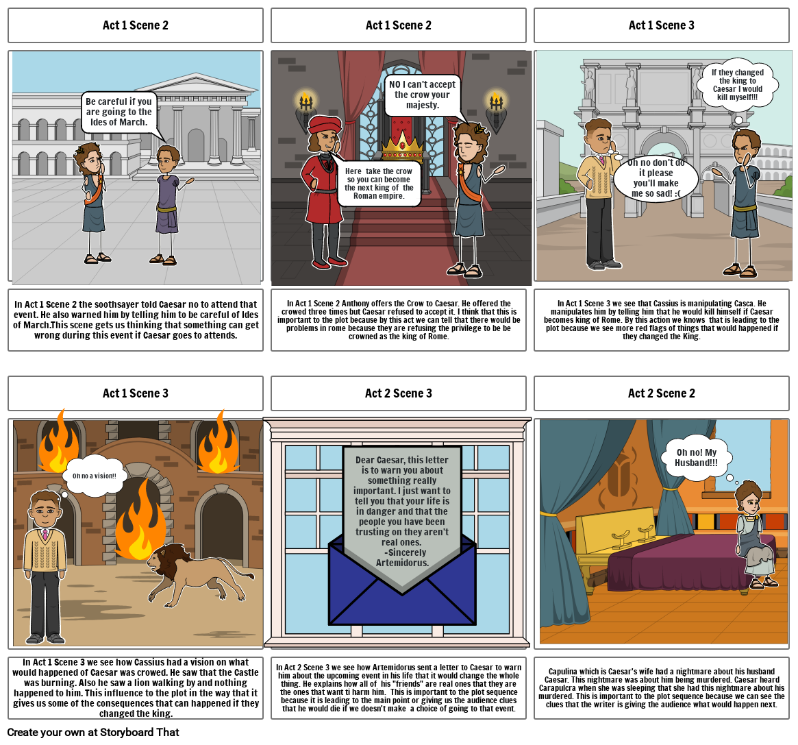 In Act 1 Scene 3 we see how Cassius had a vision on what would happened of Caesar was crowed. He saw that the Castle was burning. Also he saw a lion walking by and nothing happened to him. This influence to the plot in the way that it gives us some of the consequences that can happened if they changed the king.