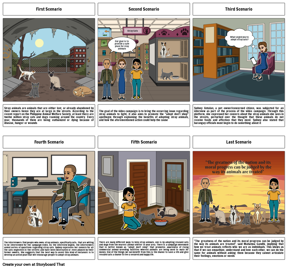 The interviewers find people who owns stray animals, specifically cats; that are willing to be interviewed for the campaign video. As the interview begins, the interviewers asked series of questions regarding stray cats. Sydney expresses her concern for all the cats neglected in the streets and have been mistreated or even abused by their former owners. She suggests that the best way to avoid this kind of instances is to develop an action plan that will encourage people to adopt stray animals.