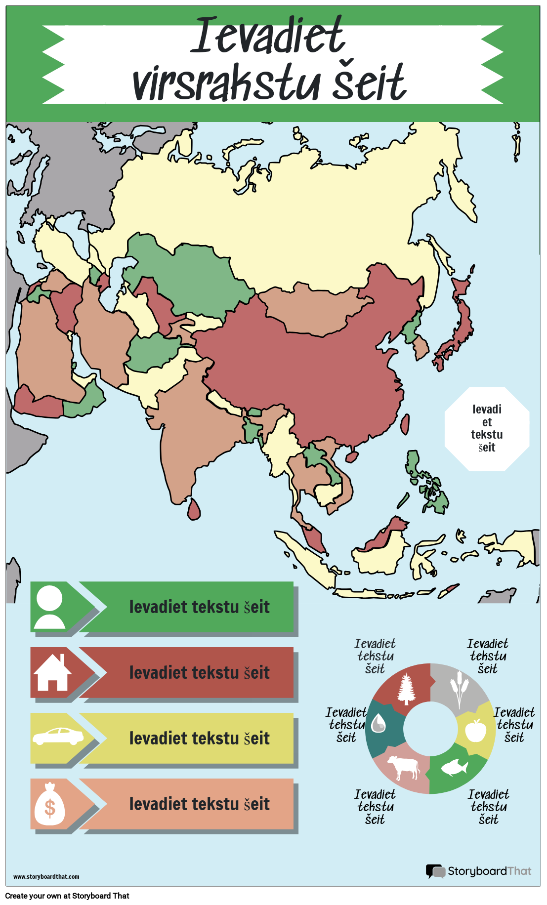 Ģeogrāfijas infografika | Izveidojiet infografiku ģeogrāfijas stundai! Parādiet svarīgus faktus un informāciju par valstīm, kontinentu un pasauli. Šajā piemērā izmantota Āzijas un Tuvo Austrumu karte, tomēr var izmantot jebkuru karti! Studenti un skolotāji var pielāgot tekstu, krāsas un grafikus, lai izveidotu savu žilbinošu ģeogrāfisko infografiku!