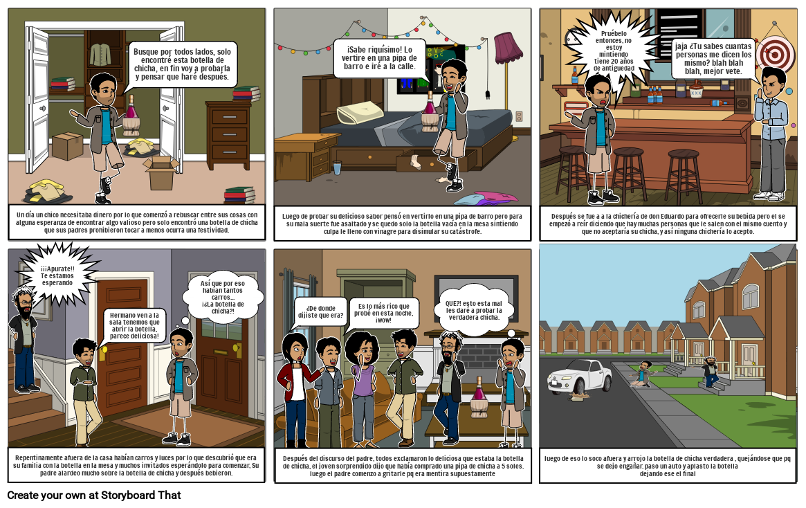Un día un chico necesitaba dinero por lo que comenzó a rebuscar entre sus cosas con alguna esperanza de encontrar algo valioso pero solo encontró una botella de chicha que sus padres prohibieron tocar a menos ocurra una festividad.