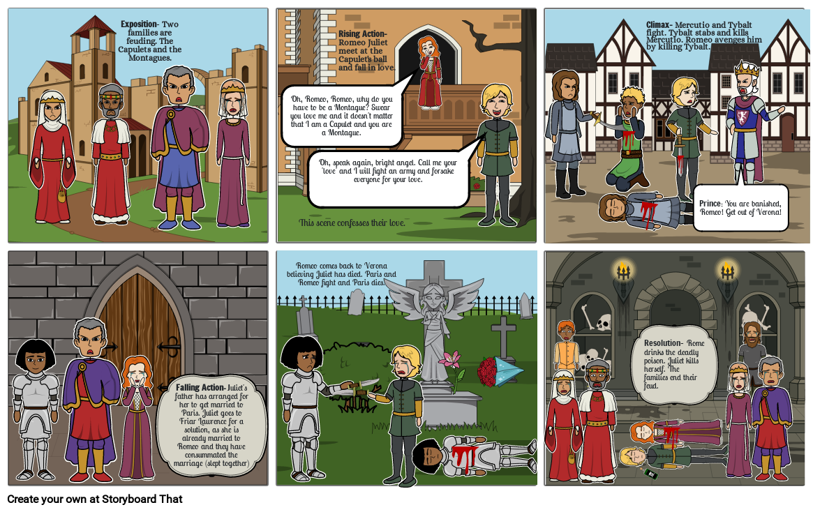 Resolution- Rome drinks the deadly poison. Juliet kills herself. The families end their feud.