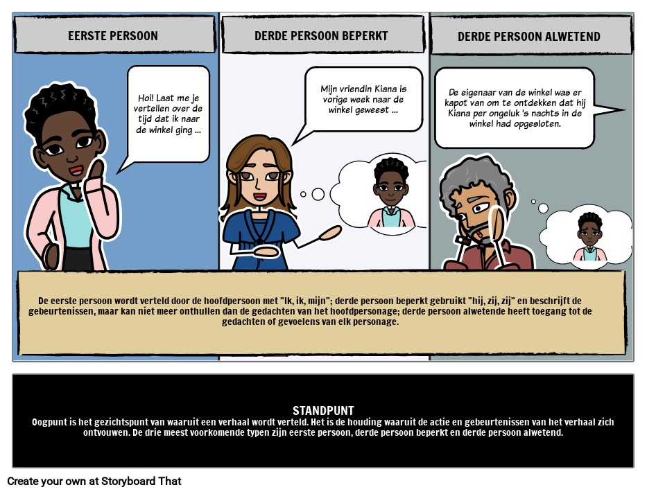 In het perspectief van de eerste persoon ziet de lezer de gebeurtenissen in het verhaal door de ogen van de verteller, wat de plot beperkt tot de ervaringen en motivaties van de verteller met behulp van voornaamwoorden als ‘ik’, ‘ik’ en ‘wij’. In de derde persoon beperkt wordt het verhaal verteld vanuit het standpunt van de verteller, die de gedachten, emoties en motivaties van de hoofdpersoon van buitenaf onthult, met behulp van voornaamwoorden als “hij”, “zij” en “zij”. In de alwetende derde persoon heeft de verteller op elk moment in het verhaal toegang tot de gedachten, emoties en motivaties van elk personage en niet alleen de hoofdpersoon.