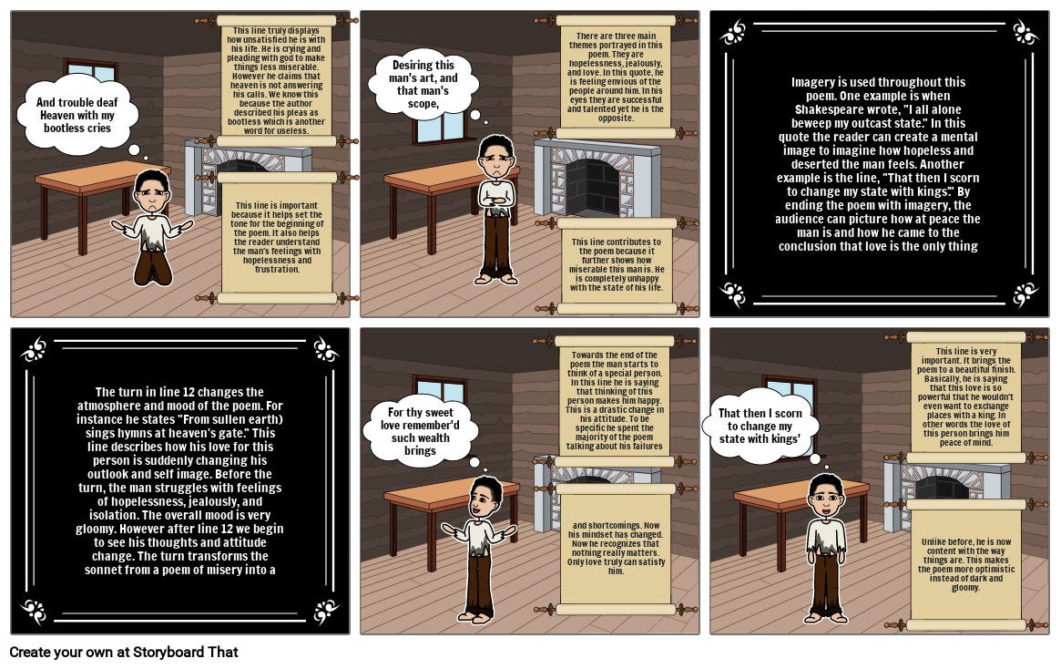 Imagery is used throughout this poem. One example is when Shakespeare wrote, "I all alone beweep my outcast state." In this quote the reader can create a mental image to imagine how hopeless and deserted the man feels. Another example is the line, "That then I scorn to change my state with kings'." By ending the poem with imagery, the audience can picture how at peace the man is and how he came to the conclusion that love is the only thing that matters.