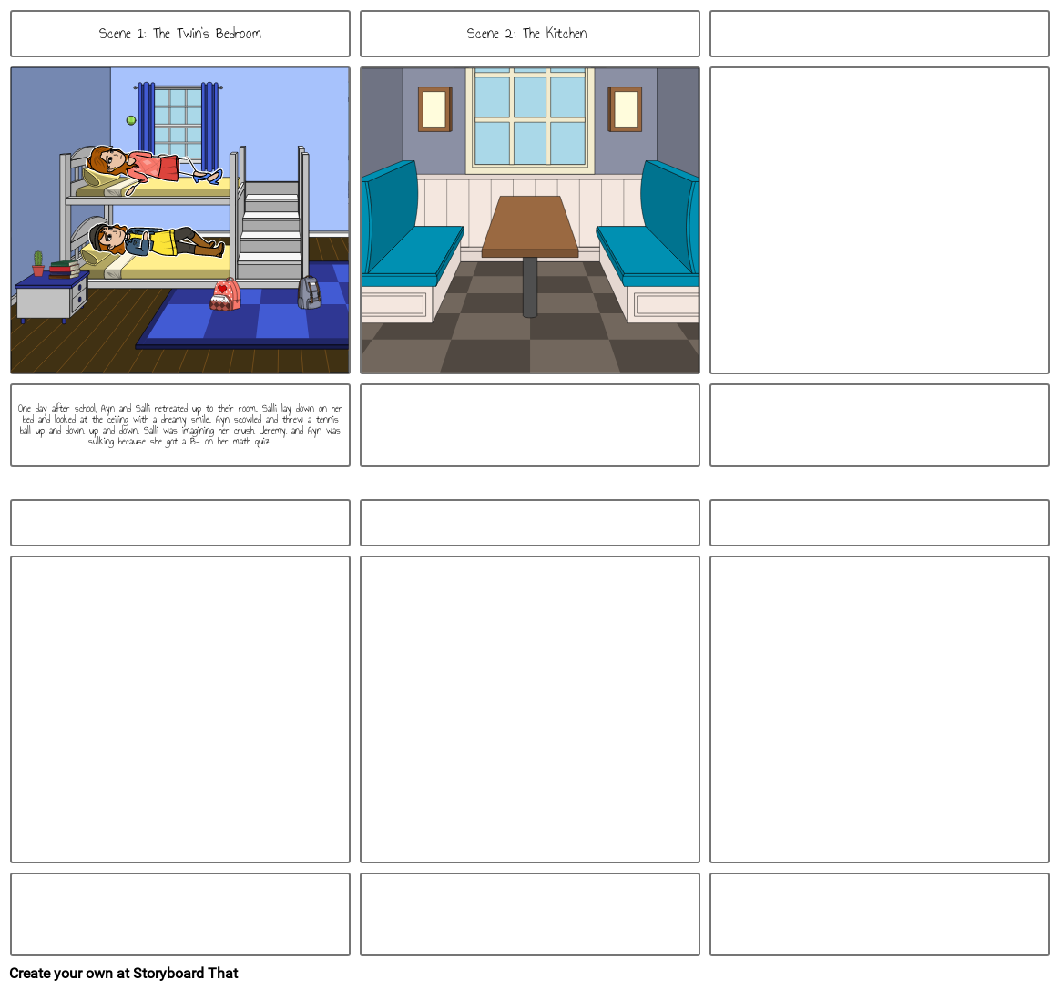 One day after school, Ayn and Salli retreated up to their room. Salli lay down on her bed and looked at the ceiling with a dreamy smile. Ayn scowled and threw a tennis ball up and down, up and down. Salli was imagining her crush, Jeremy, and Ayn was sulking because she got a B- on her math quiz.