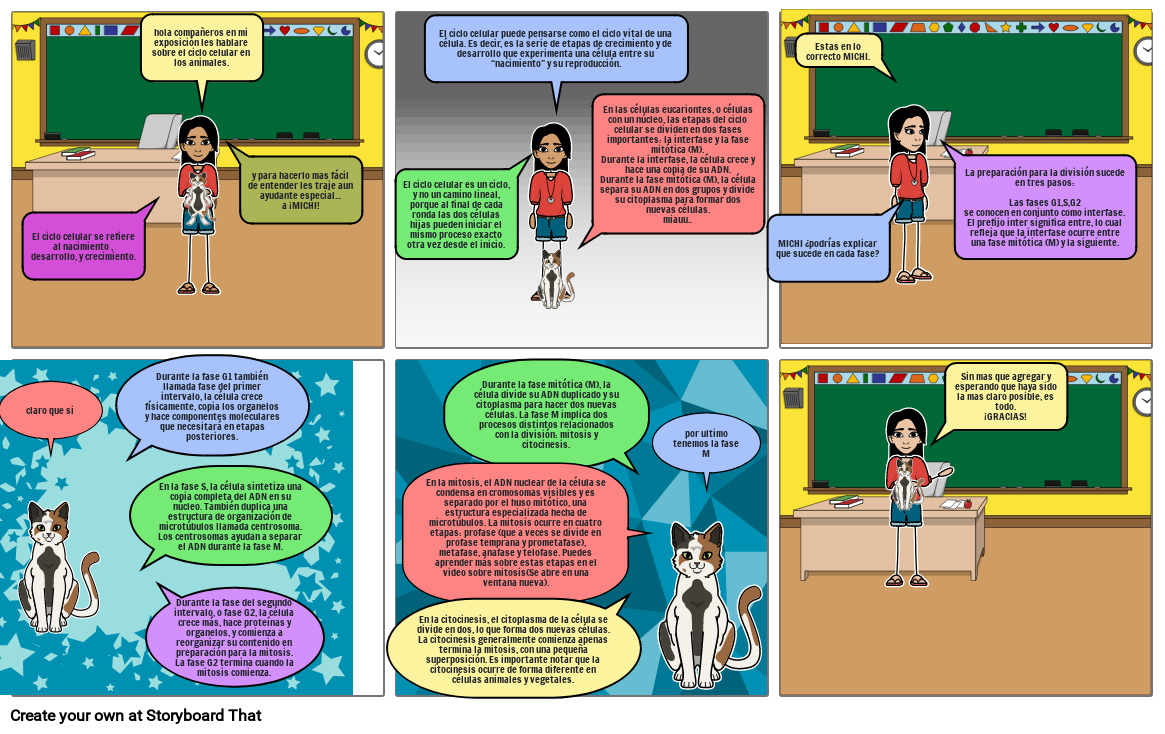 En las células eucariontes, o células con un núcleo, las etapas del ciclo celular se dividen en dos fases importantes: la interfase y la fase mitótica (M).Durante la interfase, la célula crece y hace una copia de su ADN.Durante la fase mitótica (M), la célula separa su ADN en dos grupos y divide su citoplasma para formar dos nuevas células. miauu..