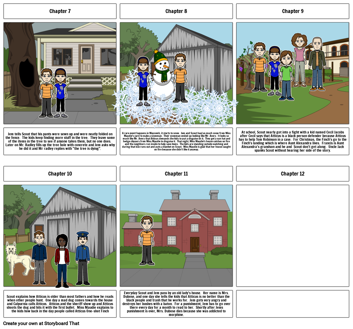 At school, Scout nearly got into a fight with a kid named Cecil Jacobs after Cecil says that Atticus is a black person defender because Atticus has to help Tom Robinson in a case. For Christmas, the Finch's go to the Finch's landing which is where Aunt Alexandra lives. Francis is Aunt Alexandra's grandson and he and Scout don't get along. Uncle Jack spanks Scout without hearing her side of the story.